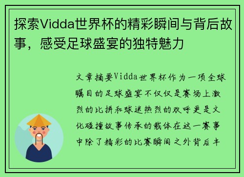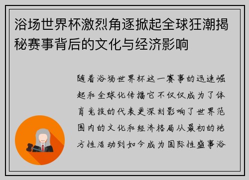 文章摘要:本文探讨了陶虹《世界杯掀起的足球狂潮》这一现象,并从四个方面进行了详细阐述。首先,文章分析了世界杯赛事如何激发全球足球热潮,尤其是对中国乃至全球文化的深远影响;其次,文章着重阐述了足球文化的传播及其在中国的特殊意义,进一步探讨了中国足球与世界杯赛事的互动与发展;再次,文中引用了世界著名大学的研究成果,结合数据分析,探讨了世界杯赛事对于各国经济、社会与文化的多维影响;最后,文章总结了足球狂...